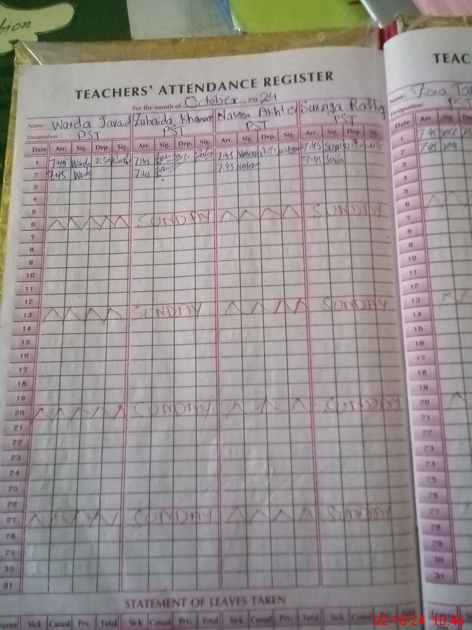 | Leave | Duty | Absent | Maternity | Medical | Ex- Pak |