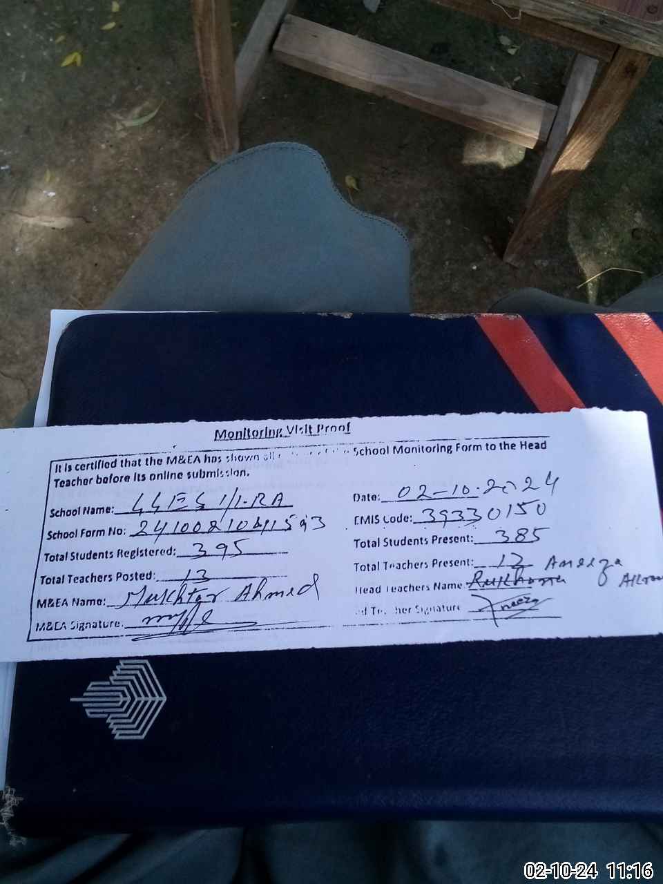 | Attendance Register | Head Teacher | MEA with School | Visit Proof |