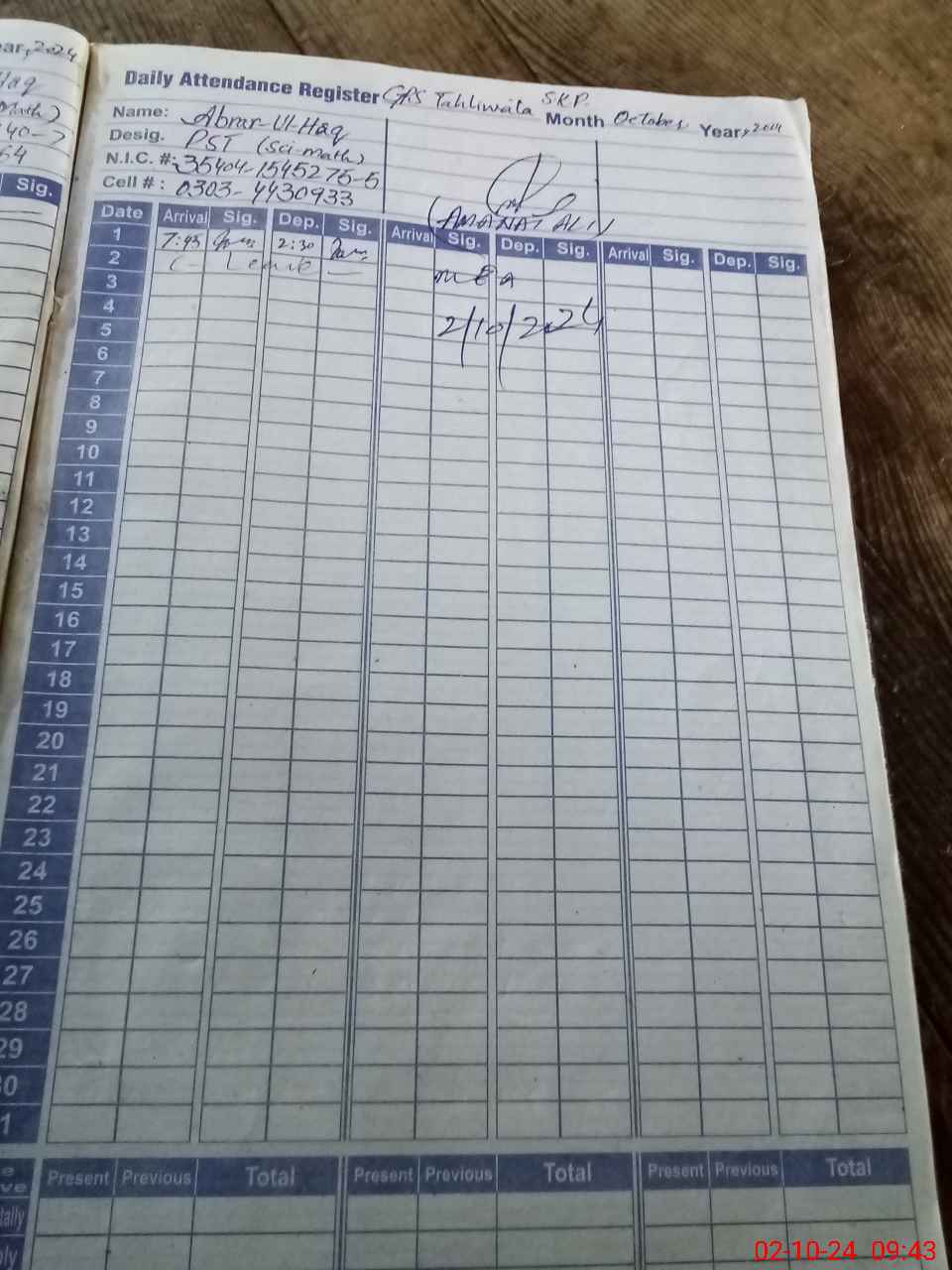 | Name: Ar**** Al**** Designation: (School Headmaster's/Headmistress's) PST Phone/Cell Number: 03**** |