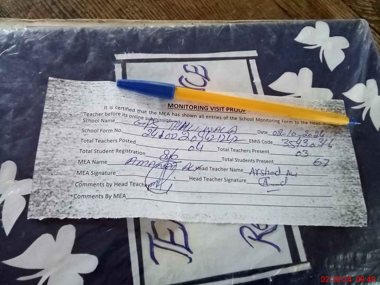 | Attendance Register | Head Teacher | MEA with School | Visit Proof |