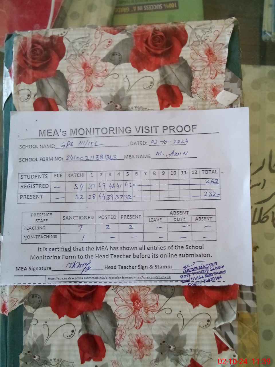 | Attendance Register | Head Teacher | MEA with School | Visit Proof |