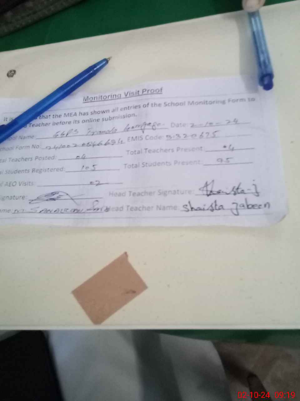 | Monitoring Date: 02-10-2024 | Start Time: 02-10-2024 08:45 AM | End Time: 02-10-2024 09:21 AM | Name of MEA: Mu**** Sa**** Ul**** Sa**** | |