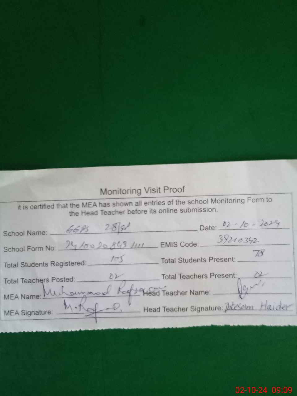 | Certified that this School was Inspected by the Undersigned MEA/DMO Today and the Information Stated Above is as Per Record. | |||||