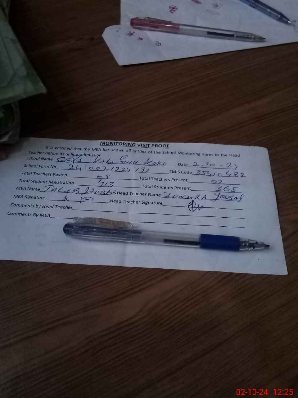 | Attendance Register | Head Teacher | MEA with School | Visit Proof |