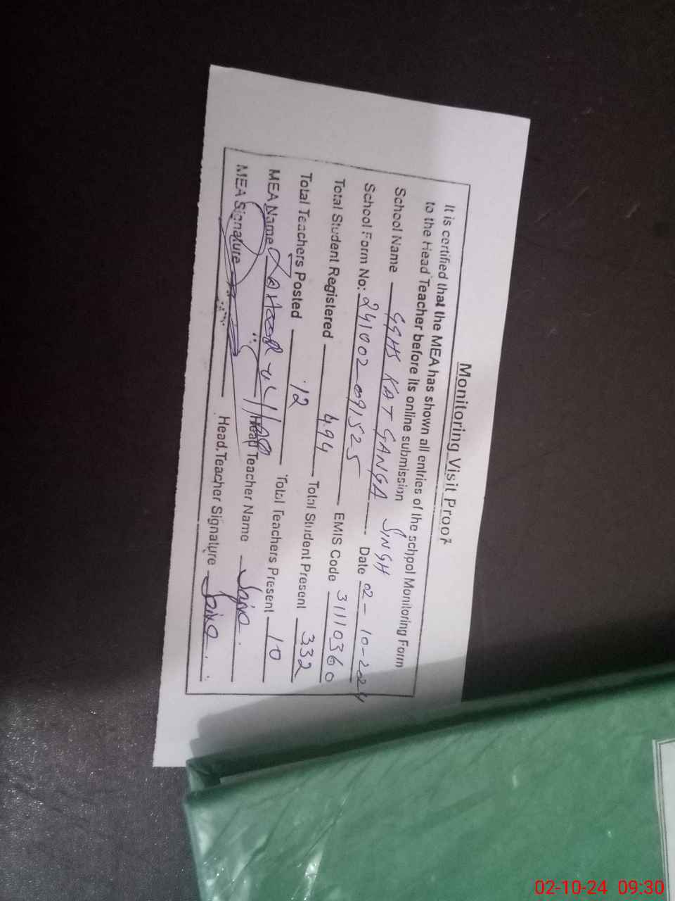 | Attendance Register | Head Teacher | MEA with School | Visit Proof |
