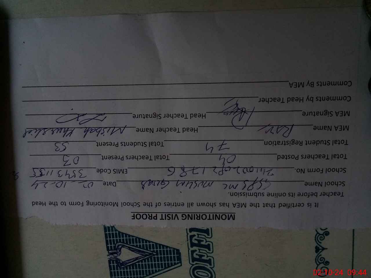 | Certified that this School was Inspected by the Undersigned MEA/DMO Today and the Information Stated Above is as Per Record. | |||||
