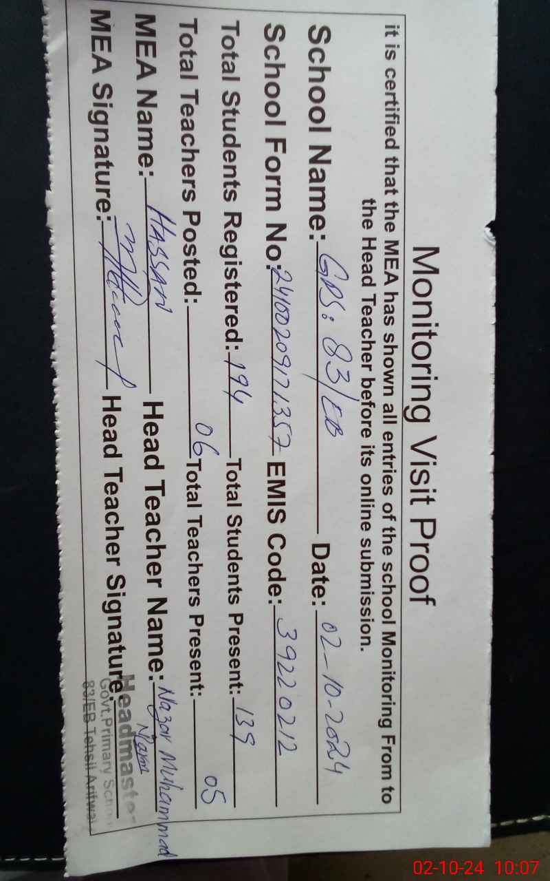 | Certified that this School was Inspected by the Undersigned MEA/DMO Today and the Information Stated Above is as Per Record. | |||||