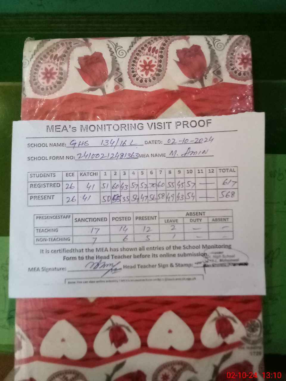 | Attendance Register | Head Teacher | MEA with School | Visit Proof |