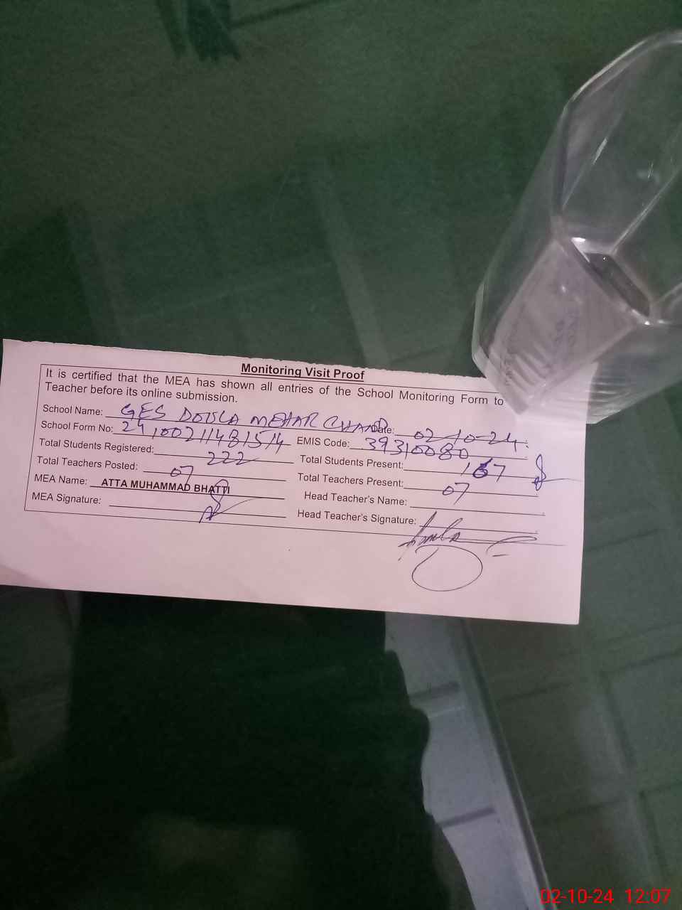 | Attendance Register | Head Teacher | MEA with School | Visit Proof |