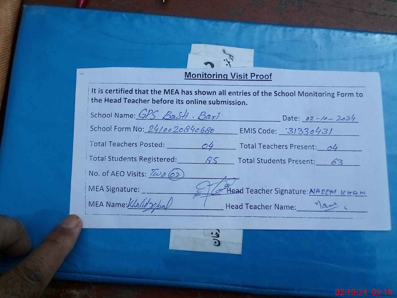 | Attendance Register | Head Teacher | MEA with School | Visit Proof |