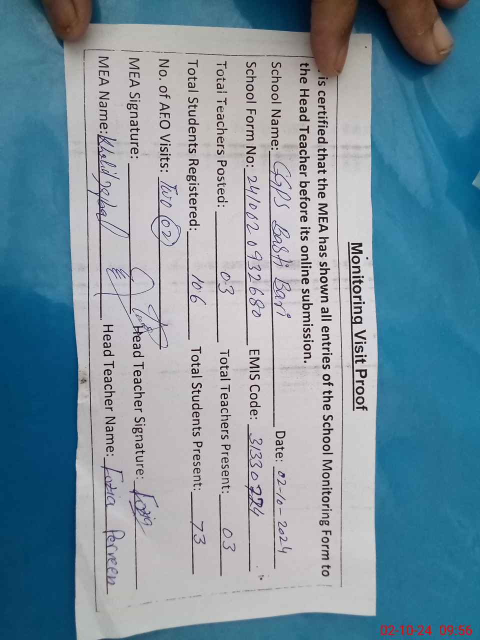 | Certified that this School was Inspected by the Undersigned MEA/DMO Today and the Information Stated Above is as Per Record. | |||||