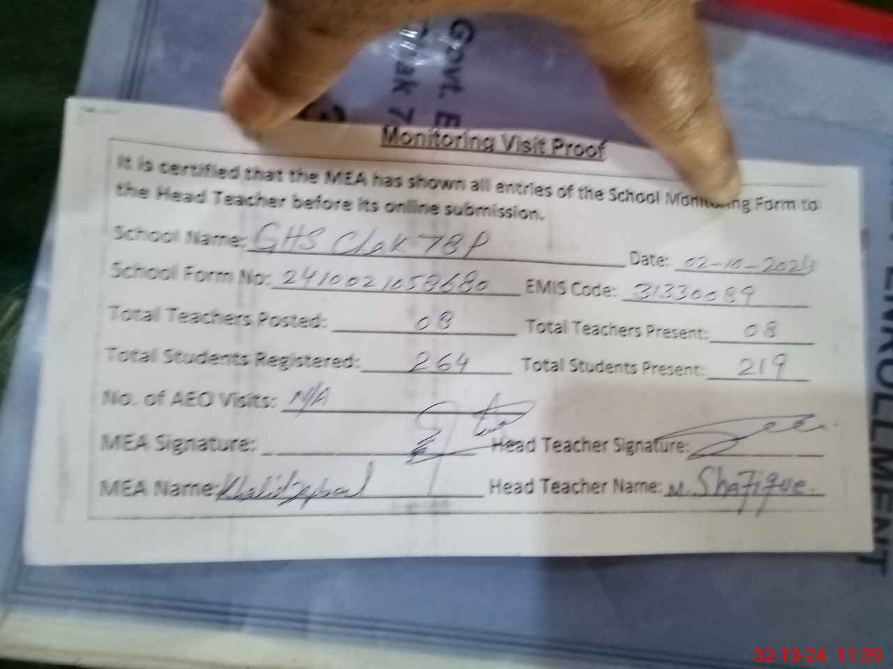 | Certified that this School was Inspected by the Undersigned MEA/DMO Today and the Information Stated Above is as Per Record. | |||||