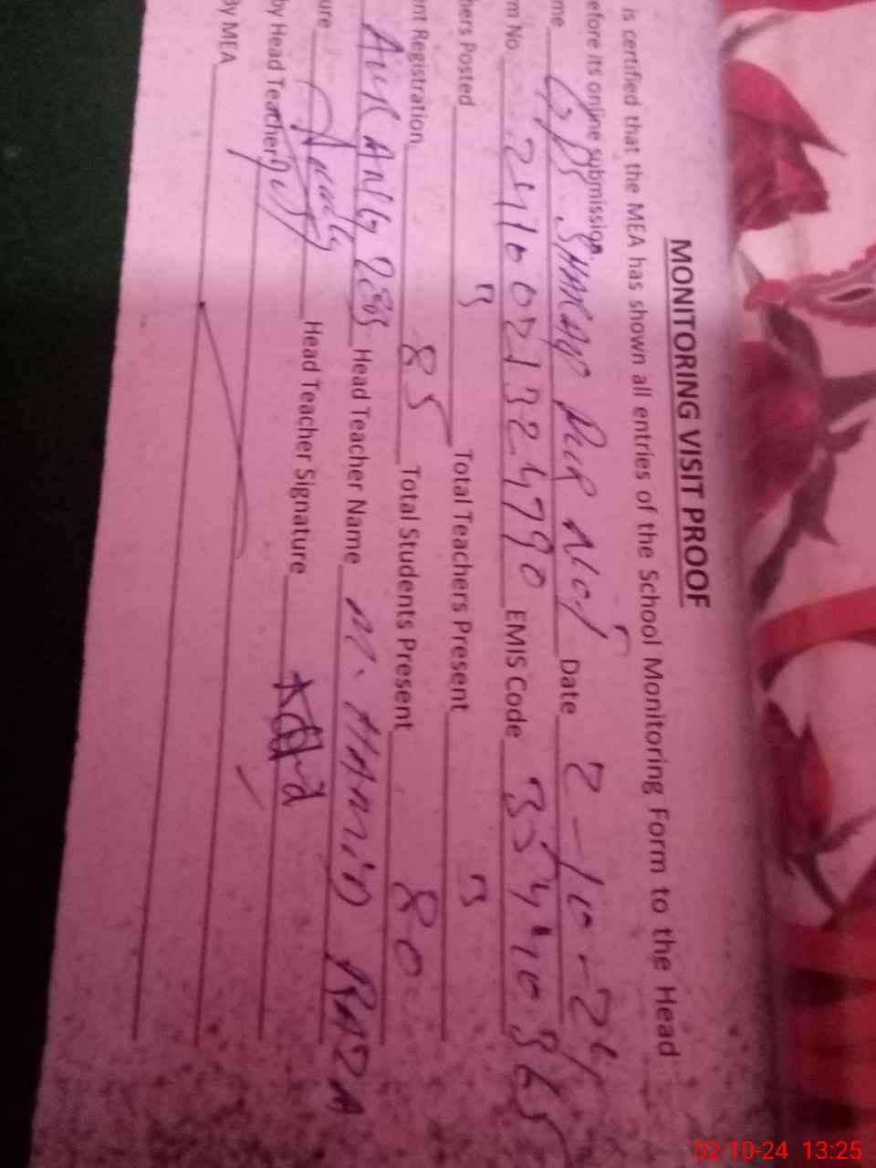 | Attendance Register | Head Teacher | MEA with School | Visit Proof |