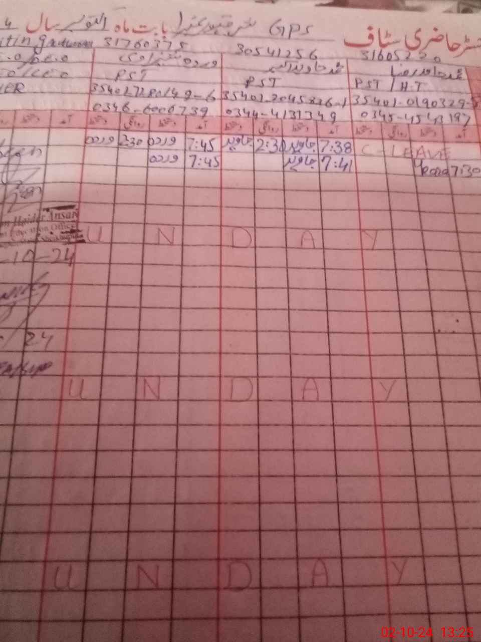 | CNIC | Full Name | Designation | R/C | Absence during last cal. month |