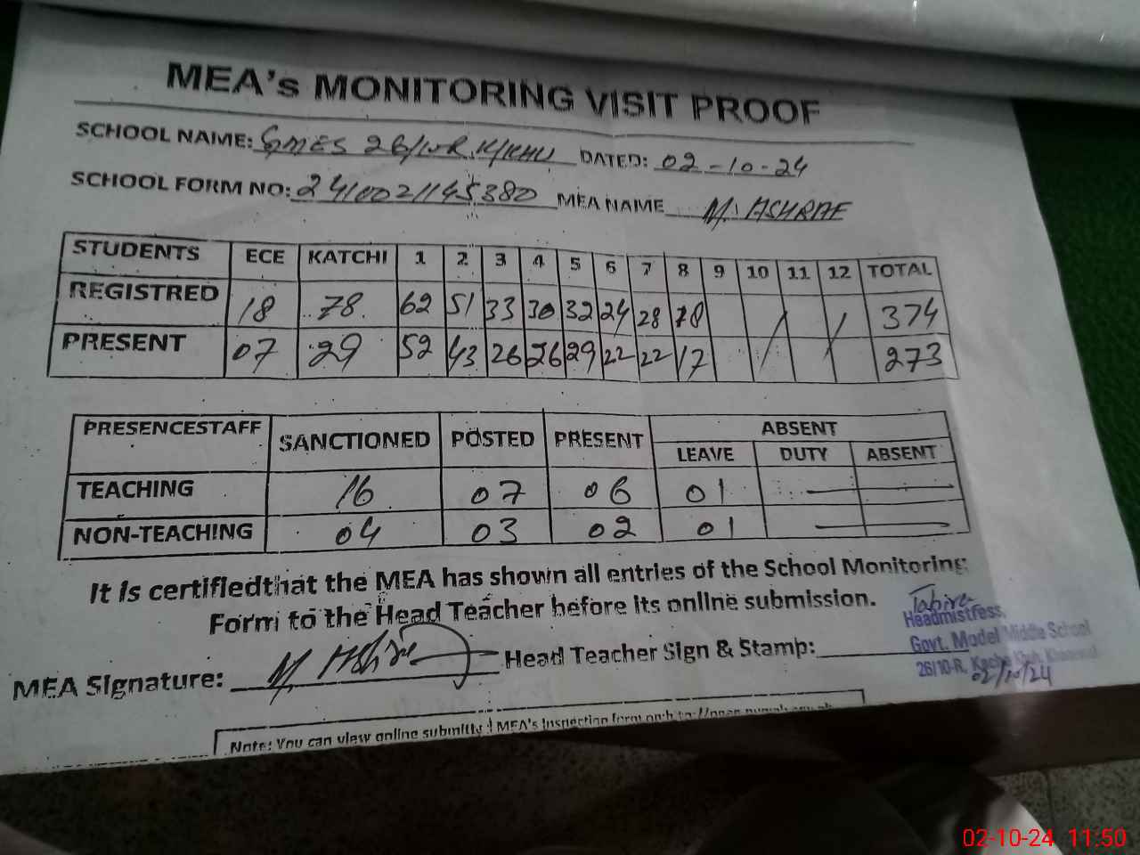 | Attendance Register | Head Teacher | MEA with School | Visit Proof |