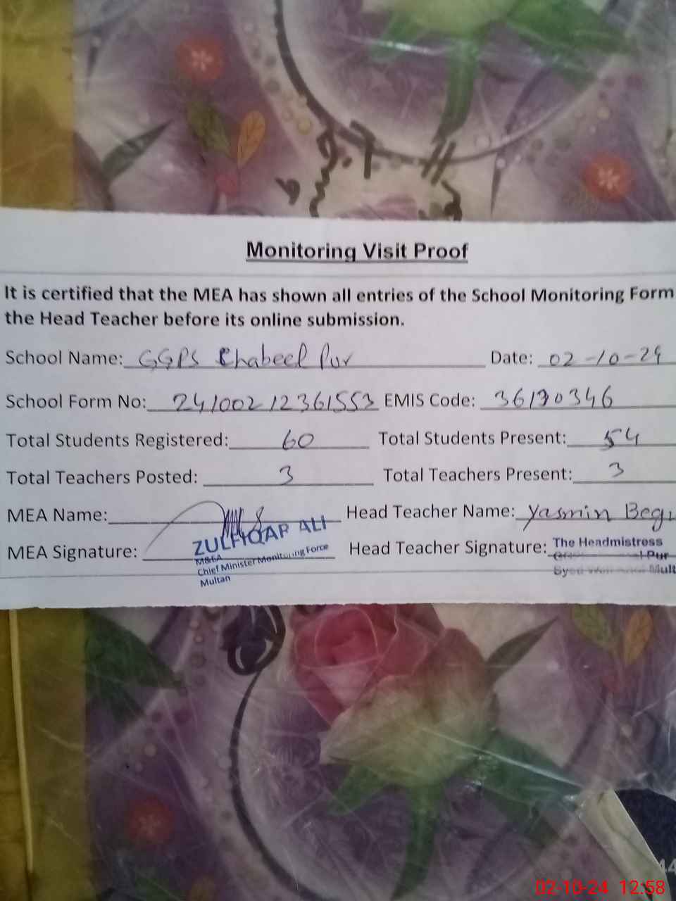 | Certified that this School was Inspected by the Undersigned MEA/DMO Today and the Information Stated Above is as Per Record. | |||||