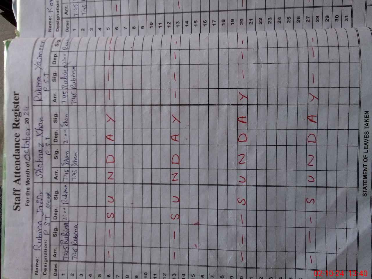 | CNIC | Full Name | Designation | R/C | Absence During Last Calender Month |