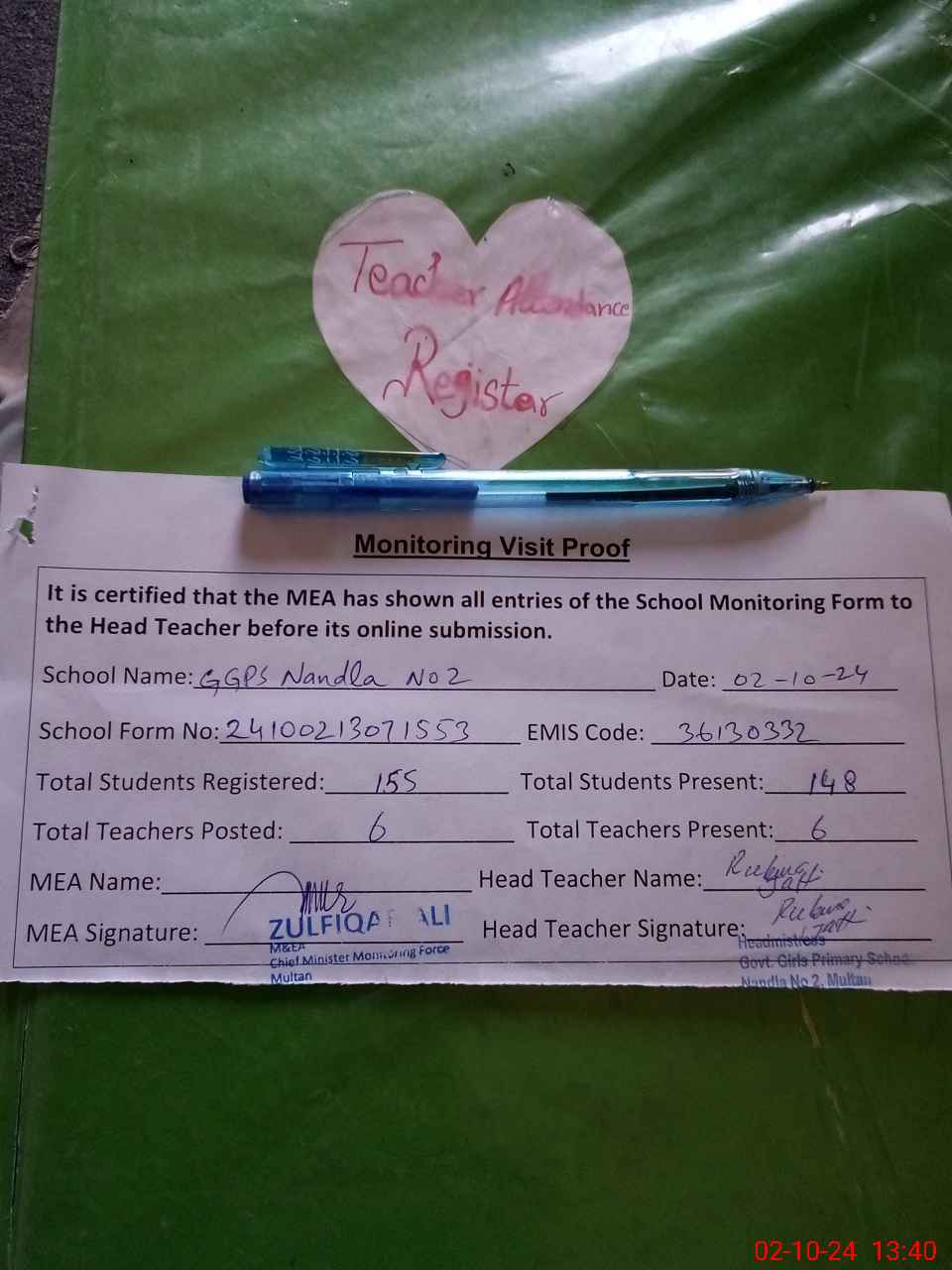 | Attendance Register | Head Teacher | MEA with School | Visit Proof |