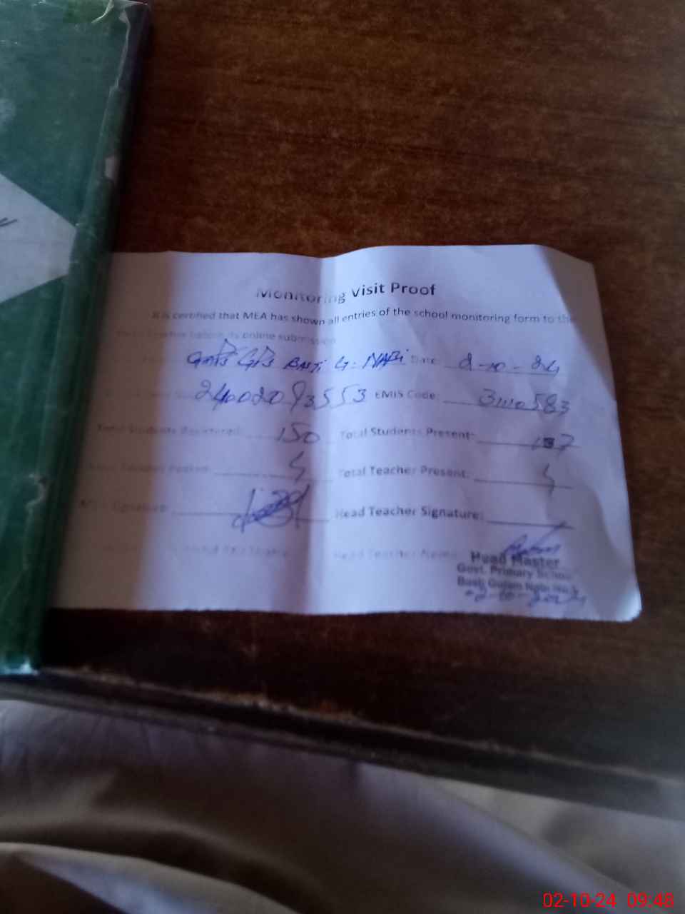 | Attendance Register | Head Teacher | MEA with School | Visit Proof |
