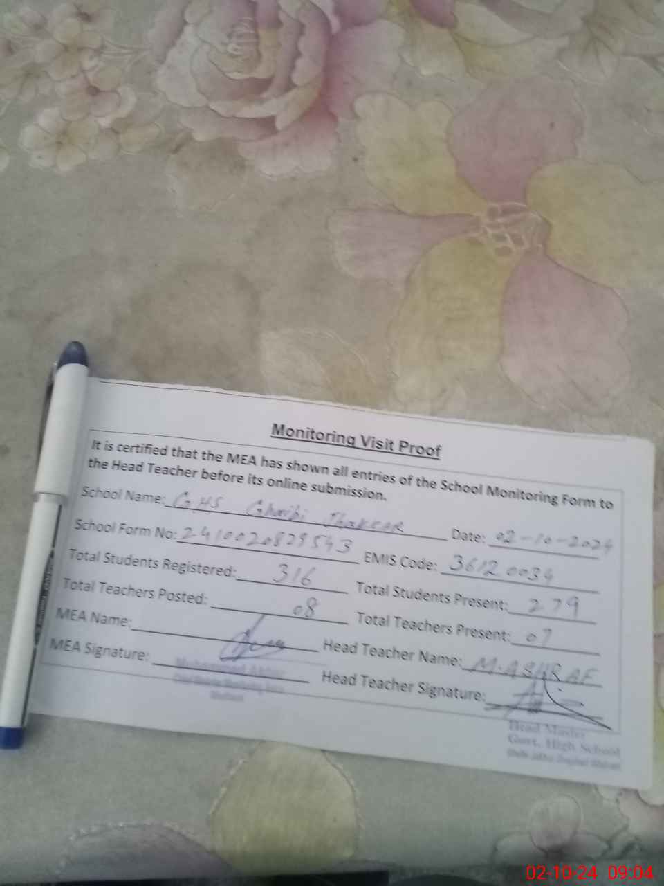 | Attendance Register | Head Teacher | MEA with School | Visit Proof |