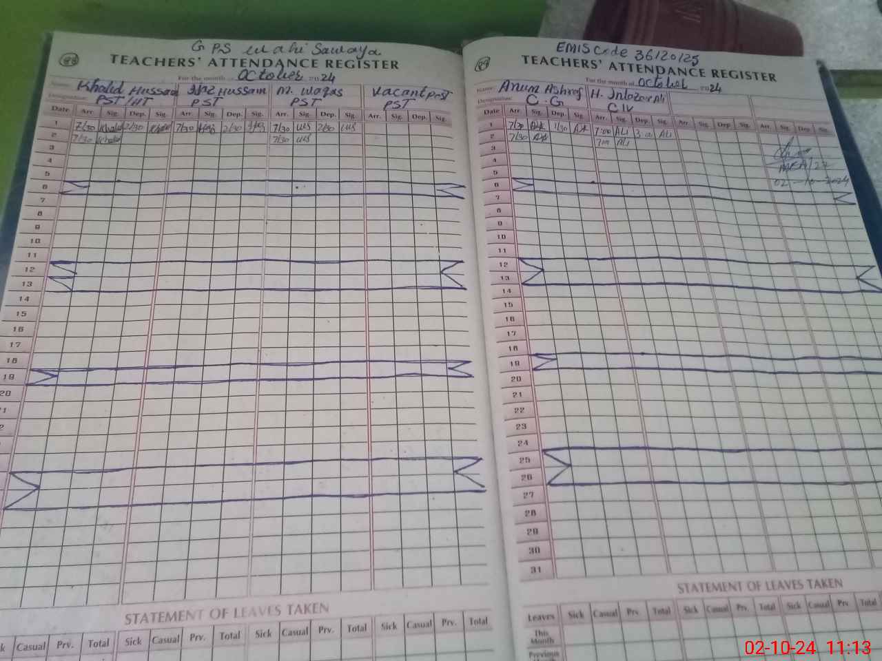 | Remarks (Use Separate Page if Required): PST Waqas attendence marked on register but physically found absent PST Ejaz attendence not marked and physically found absent | |||||