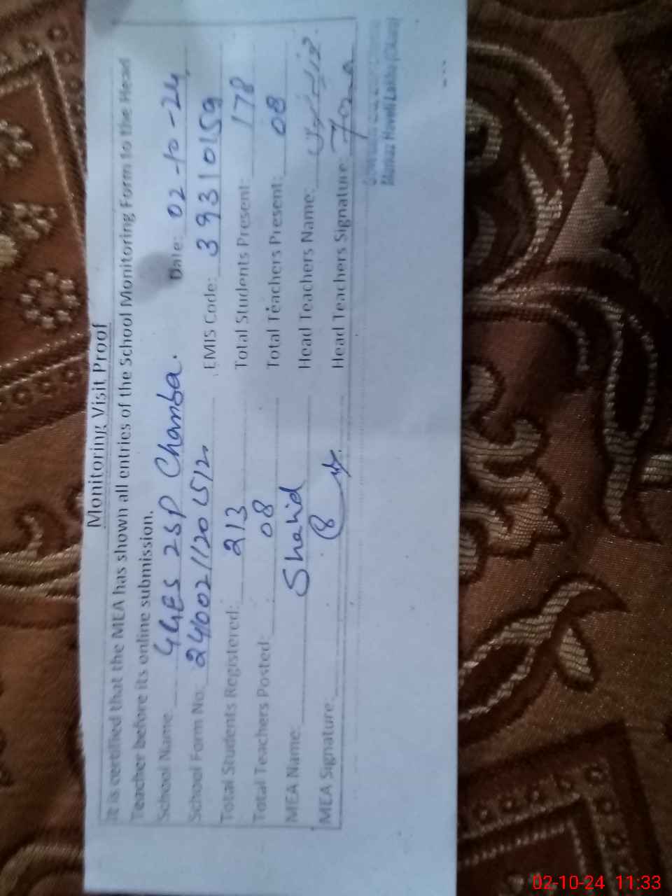| Certified that this School was Inspected by the Undersigned MEA/DMO Today and the Information Stated Above is as Per Record. | |||||