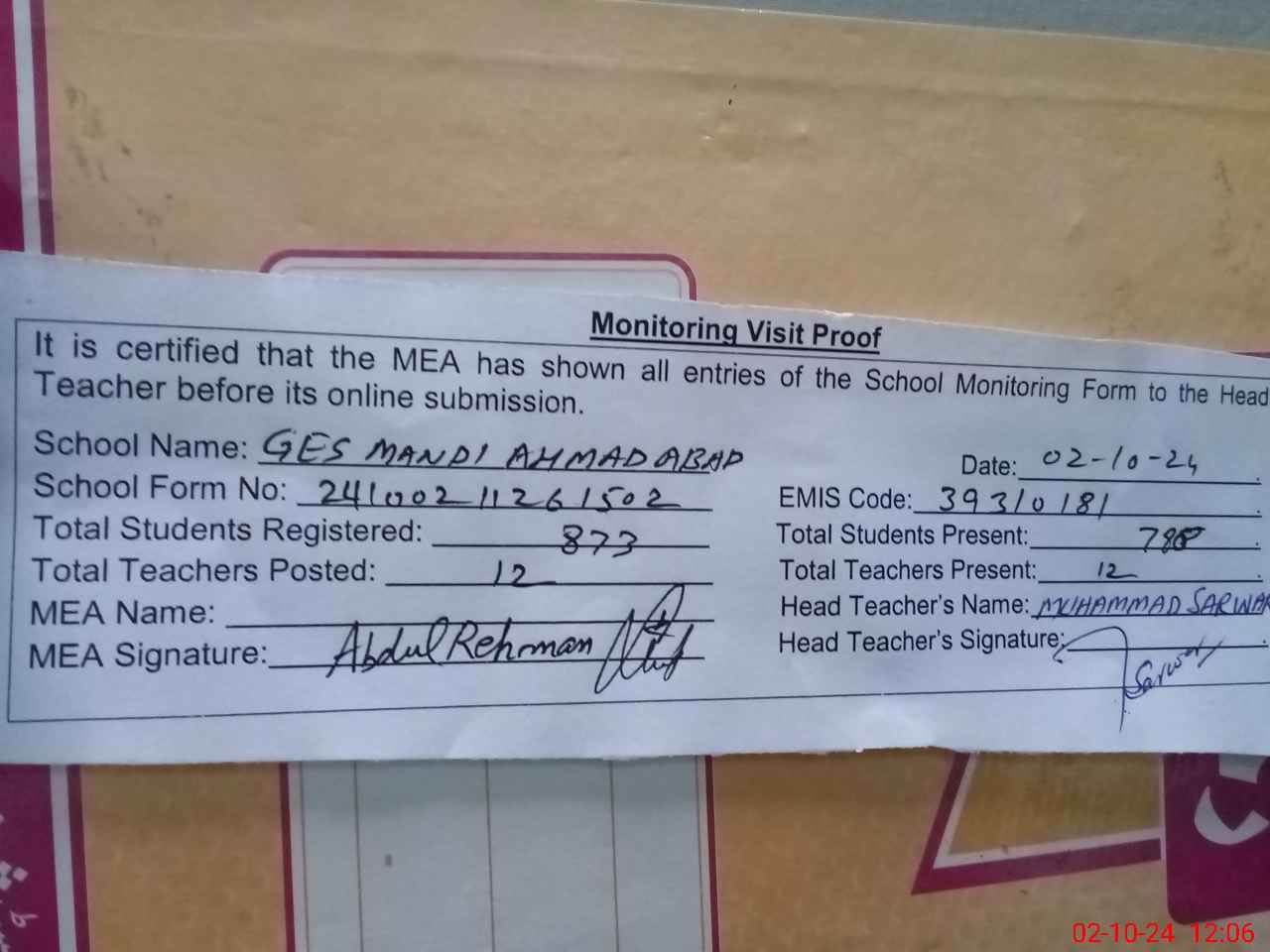 | EMIS Code: 39310181 | Name of School: GES MANDI AHMAD ABAD | |||