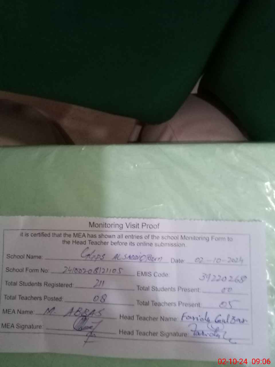 | Monitoring Date: 02-10-2024 | Start Time: 02-10-2024 08:12 AM | End Time: 02-10-2024 09:06 AM | Name of MEA: Mu**** Ab**** | |