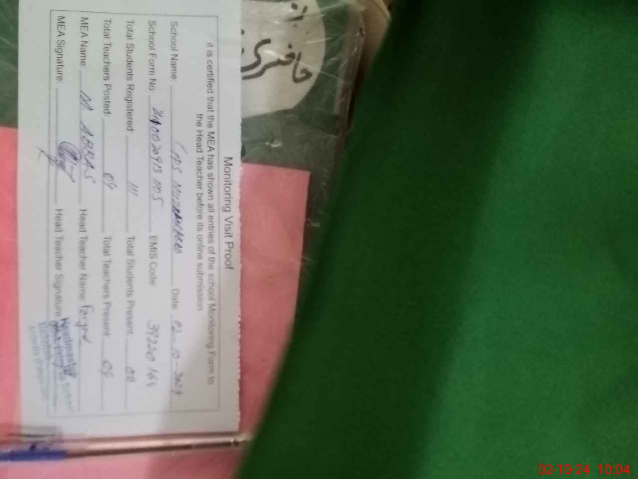 | Certified that this School was Inspected by the Undersigned MEA/DMO Today and the Information Stated Above is as Per Record. | |||||