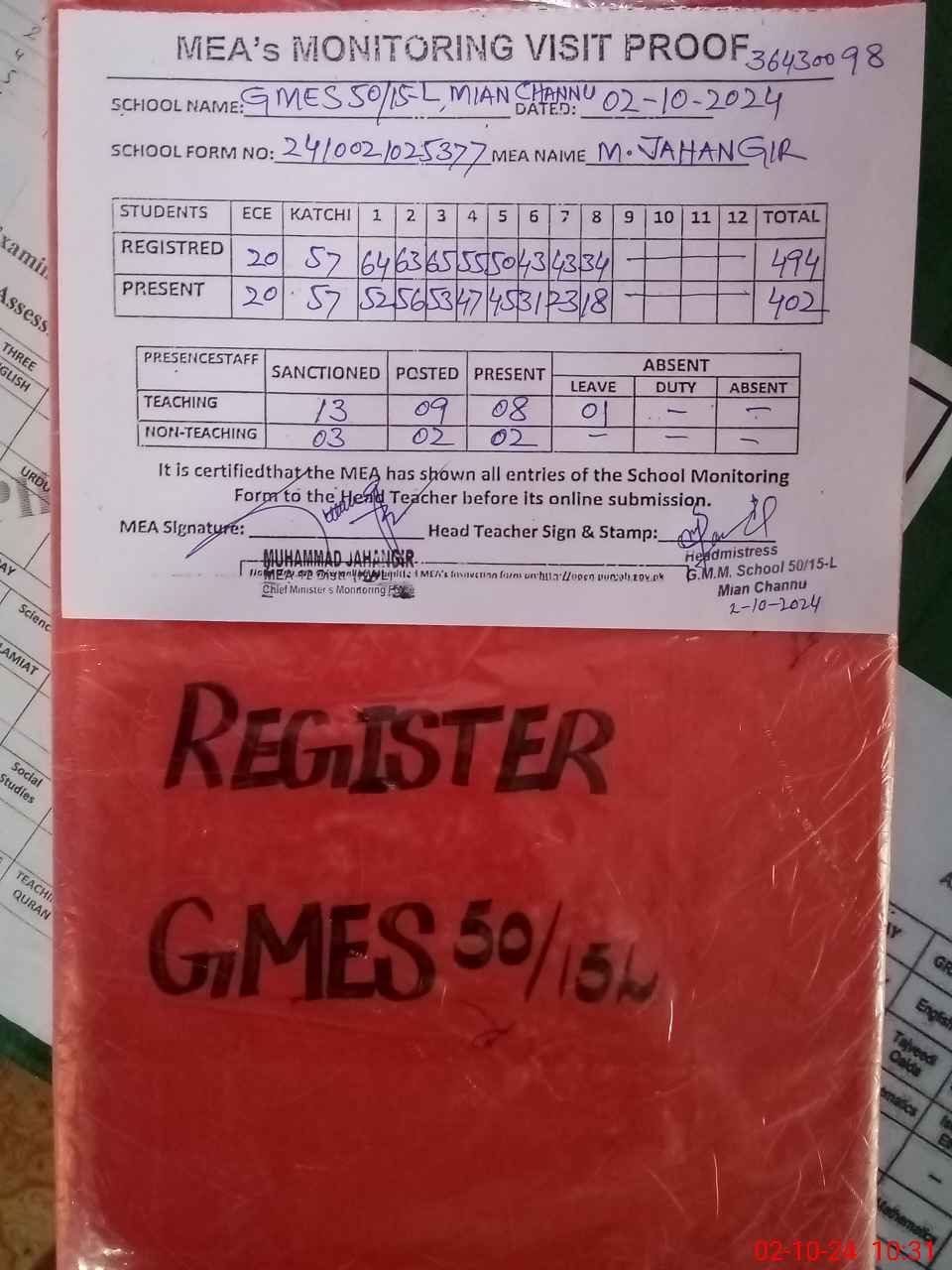 | EMIS Code: 36430098 | Name of School: GGES 50/15-L, MIAN CHANNU | |||