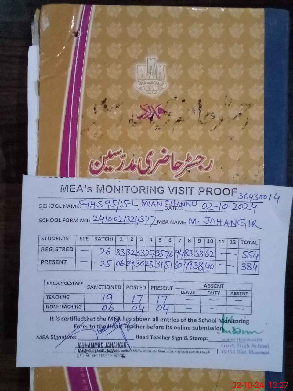 | EMIS Code: 36430014 | Name of School: GHS 95/15-L, MIAN CHANNU | |||
