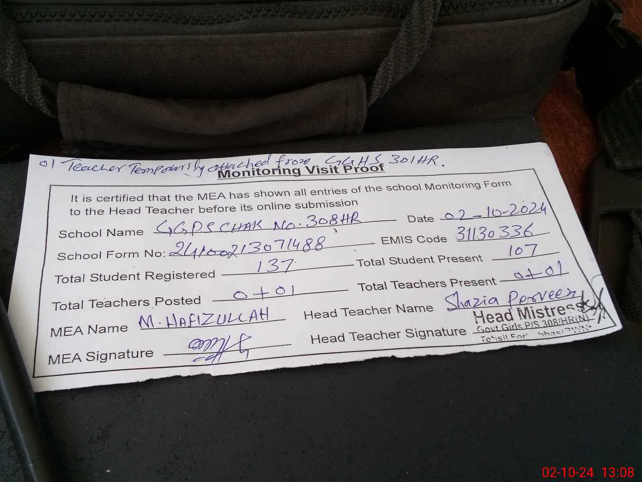 | Attendance Register | Head Teacher | MEA with School | Visit Proof |