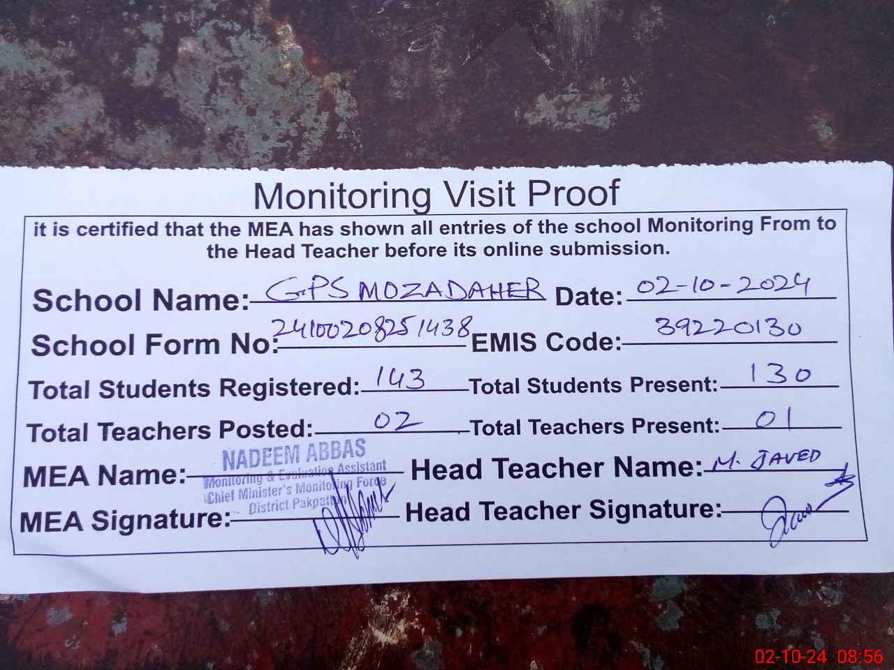| Certified that this School was Inspected by the Undersigned MEA/DMO Today and the Information Stated Above is as Per Record. | |||||