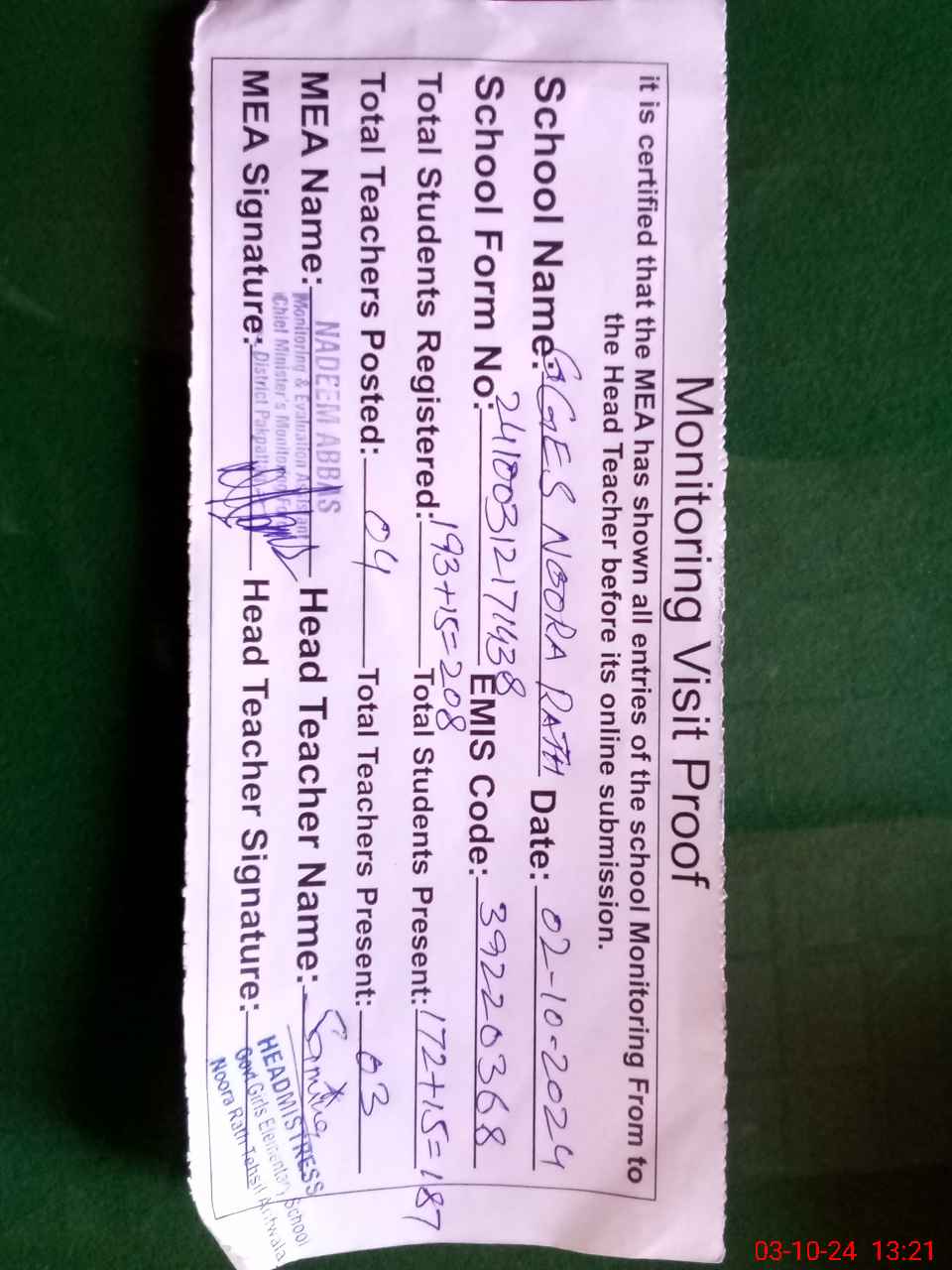 | Certified that this School was Inspected by the Undersigned MEA/DMO Today and the Information Stated Above is as Per Record. | |||||