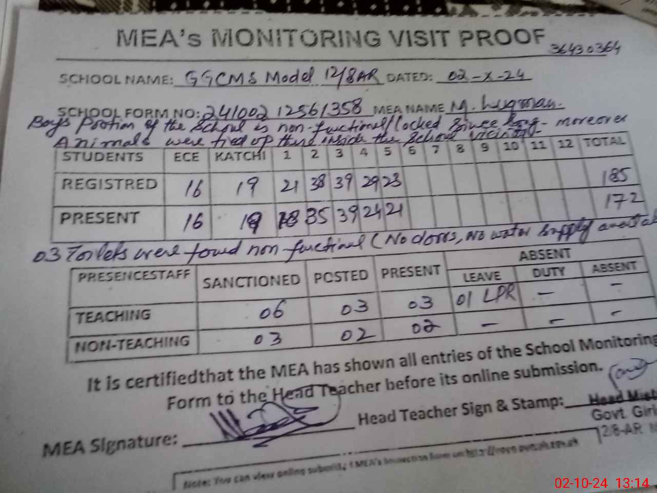 | Certified that this School was Inspected by the Undersigned MEA/DMO Today and the Information Stated Above is as Per Record. | |||||