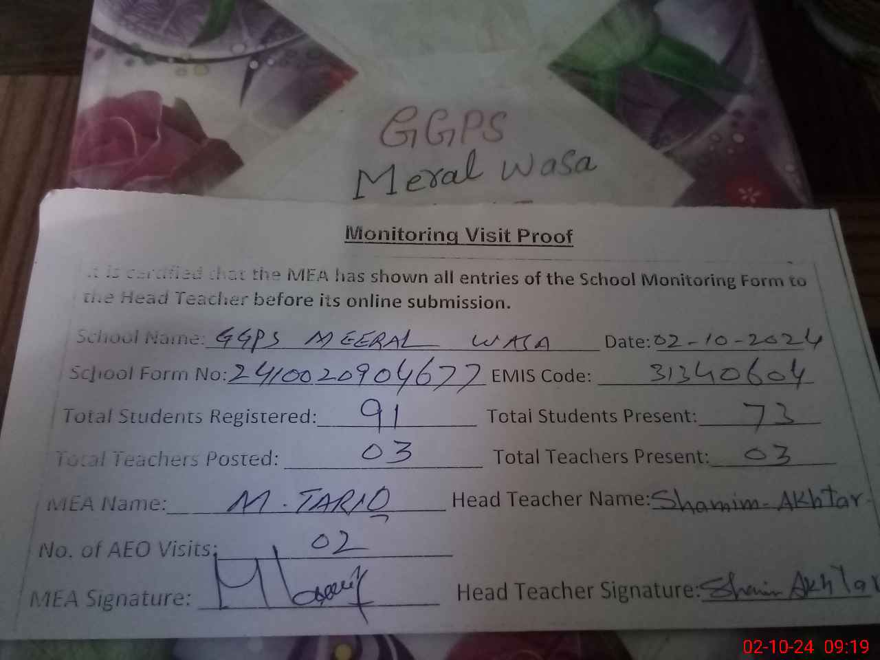 | Attendance Register | Head Teacher | MEA with School | Visit Proof |