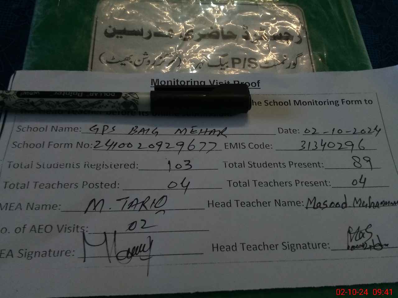 | EMIS Code: 31340296 | Name of School: GPS BAIG MEHAR | |||