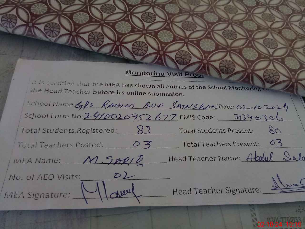 | Certified that this School was Inspected by the Undersigned MEA/DMO Today and the Information Stated Above is as Per Record. | |||||