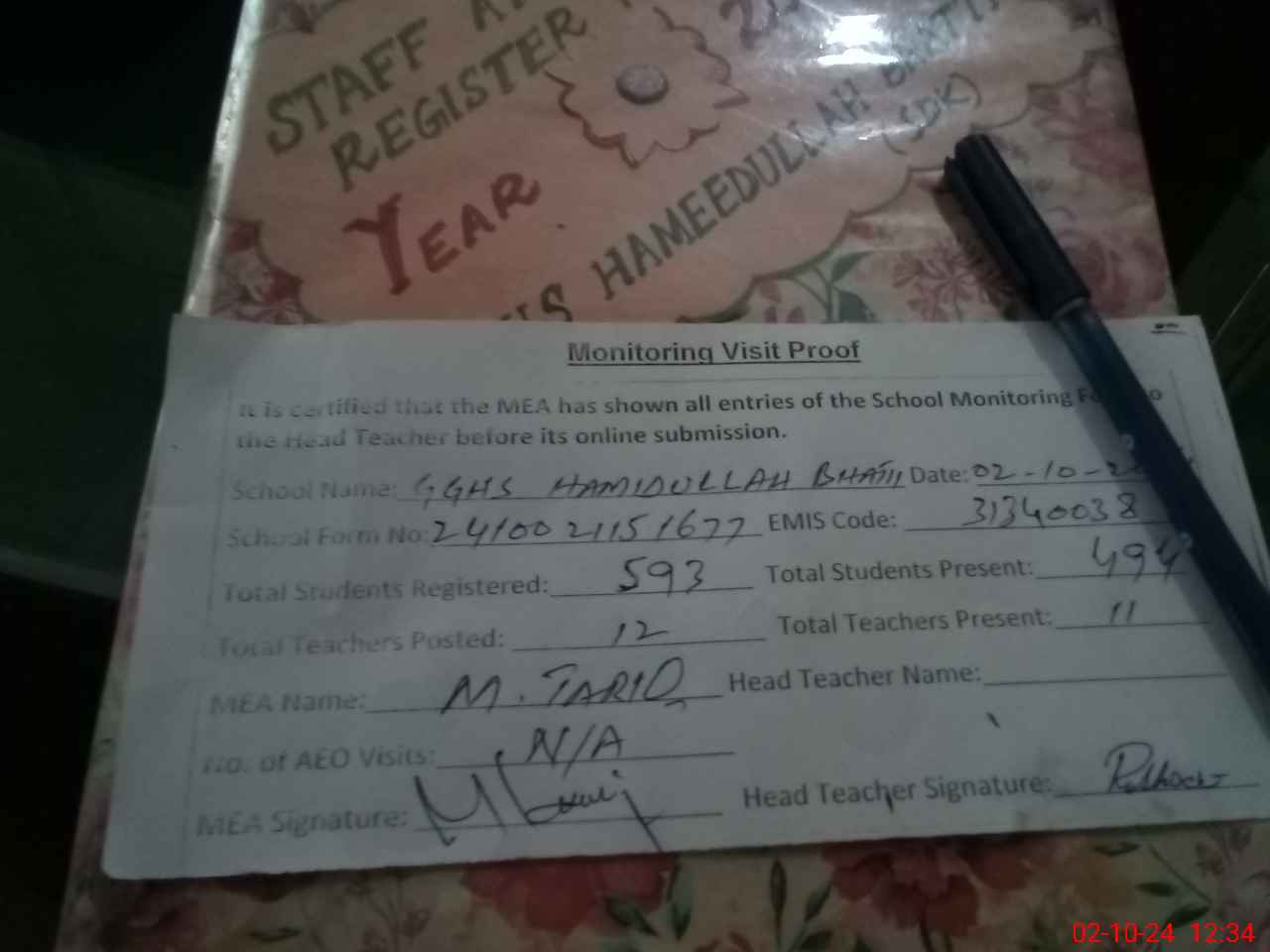 | Attendance Register | Head Teacher | MEA with School | Visit Proof |