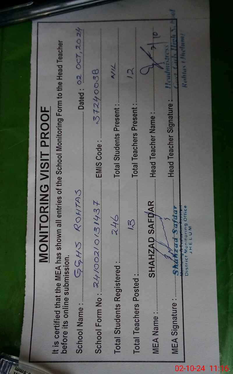| EMIS Code: 37240038 | Name of School: GGHS ROHTAS | |||