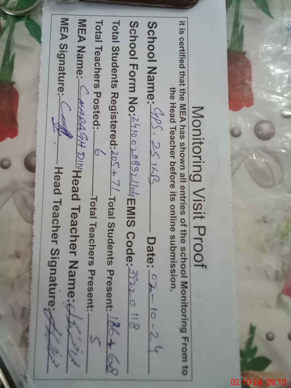 | Attendance Register | Head Teacher | MEA with School | Visit Proof |