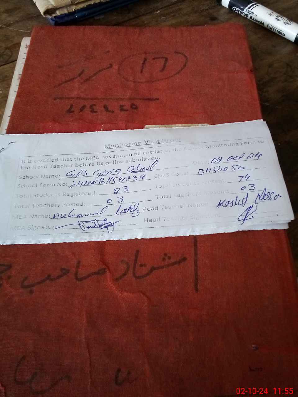 | Attendance Register | Head Teacher | MEA with School | Visit Proof |
