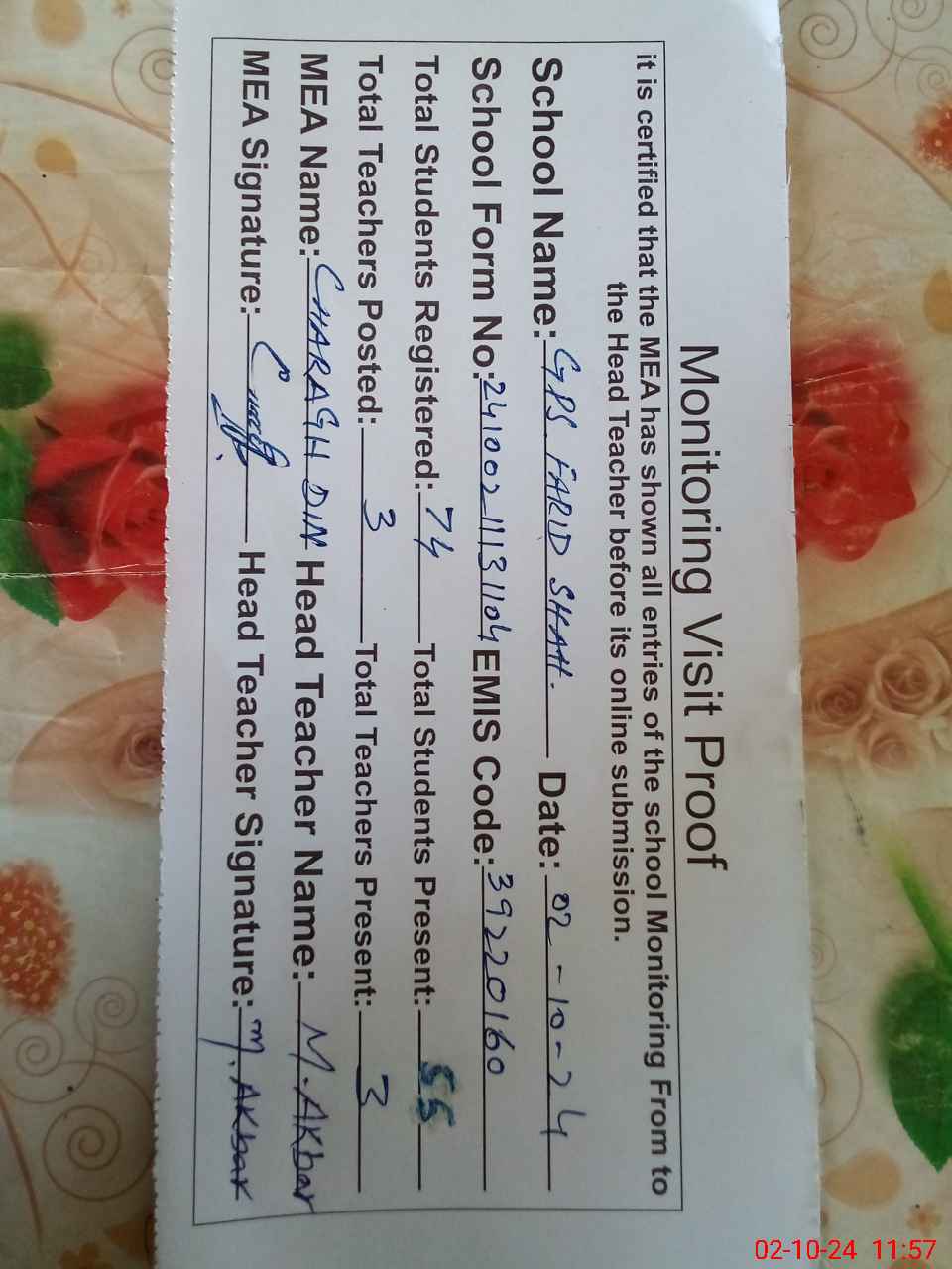 | EMIS Code: 39220160 | Name of School: GPS FARID SHAH | |||