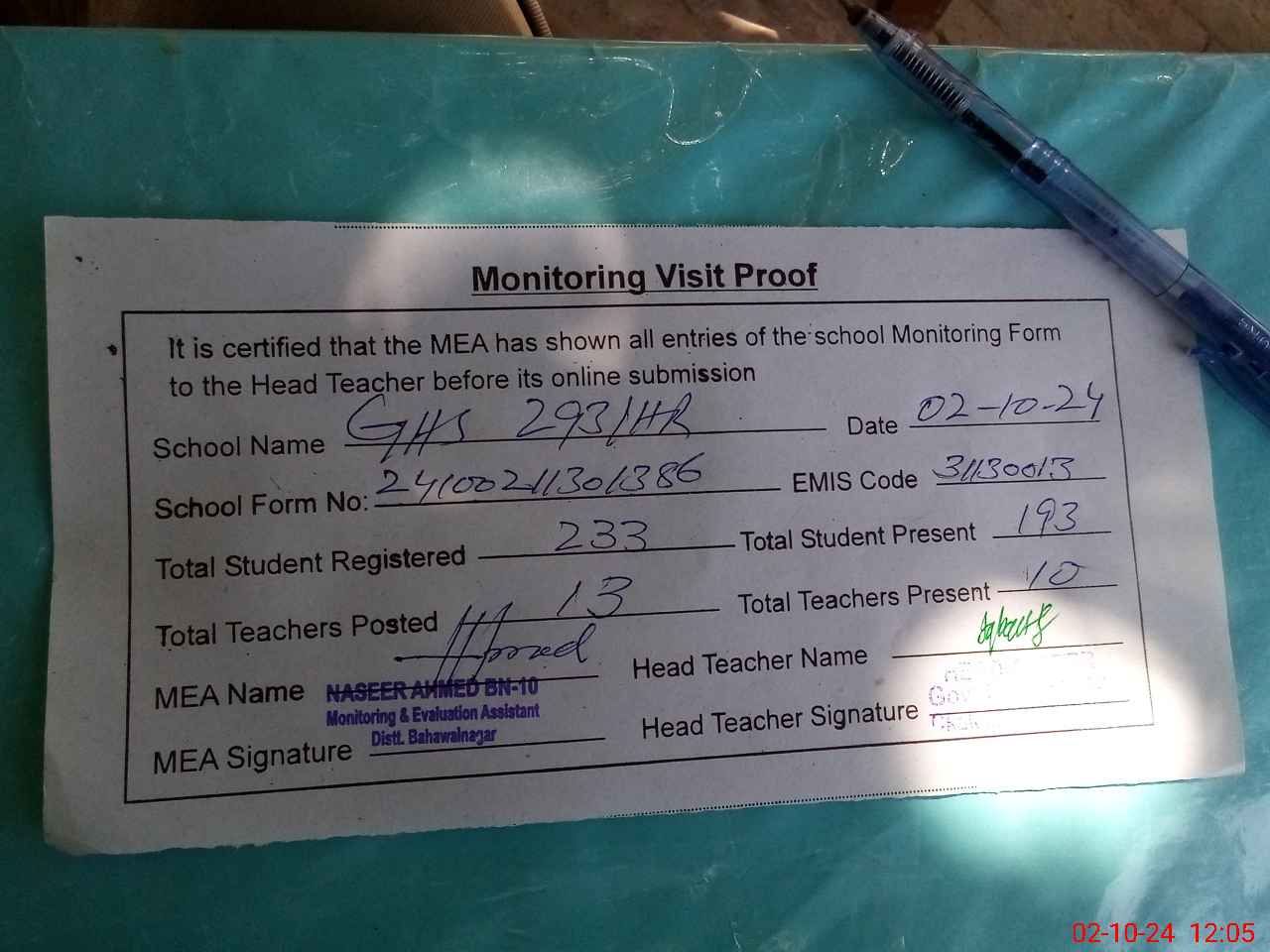 | EMIS Code: 31130013 | Name of School: GHS CHAK 293/HR | |||