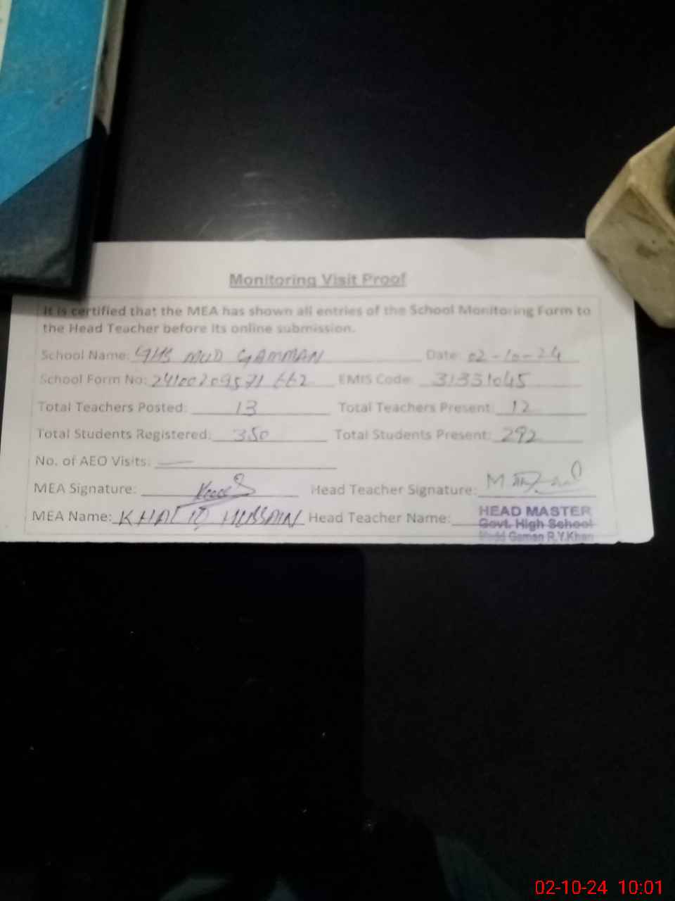 | Attendance Register | Head Teacher | MEA with School | Visit Proof |