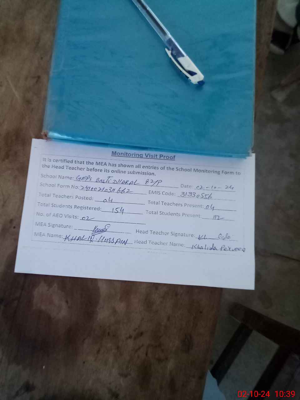 | Attendance Register | Head Teacher | MEA with School | Visit Proof |