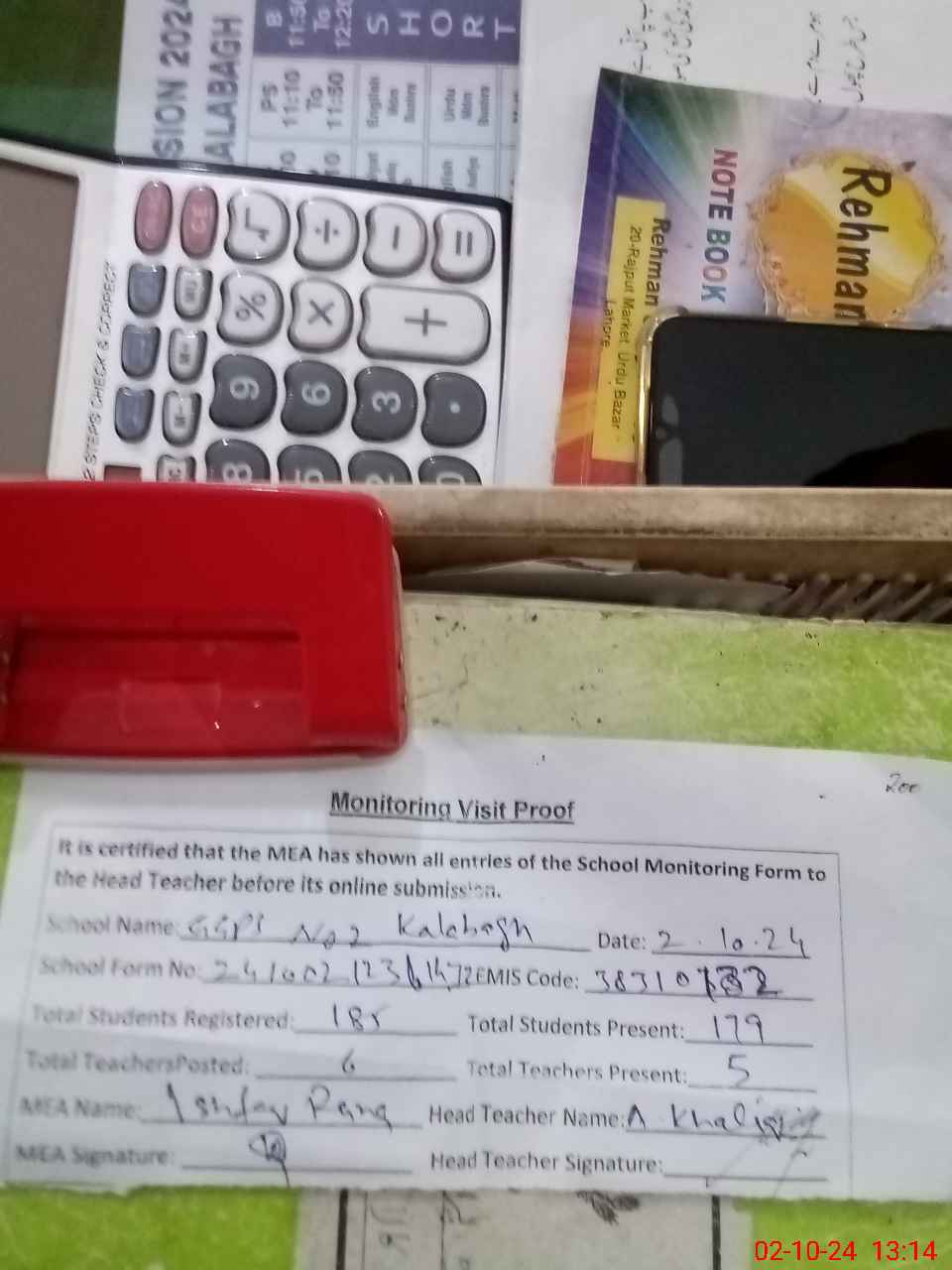 | Attendance Register | Head Teacher | MEA with School | Visit Proof |