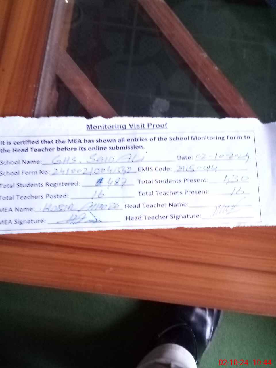 | Attendance Register | Head Teacher | MEA with School | Visit Proof |