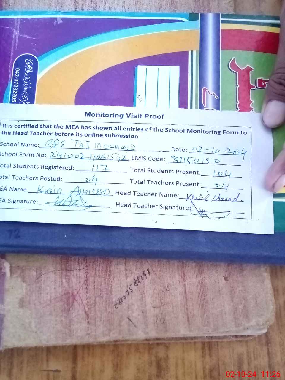 | Attendance Register | Head Teacher | MEA with School | Visit Proof |