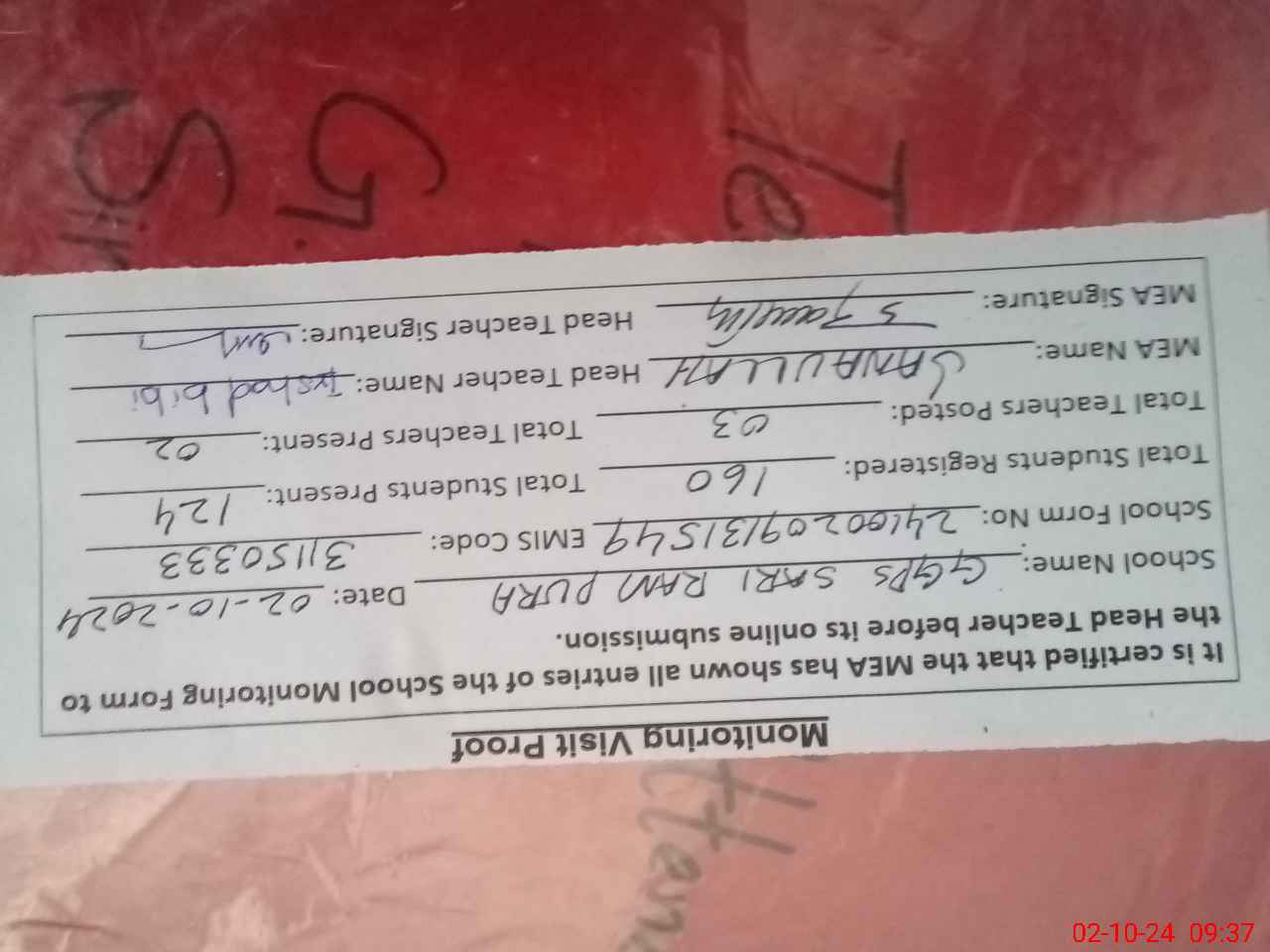 | Certified that this School was Inspected by the Undersigned MEA/DMO Today and the Information Stated Above is as Per Record. | |||||